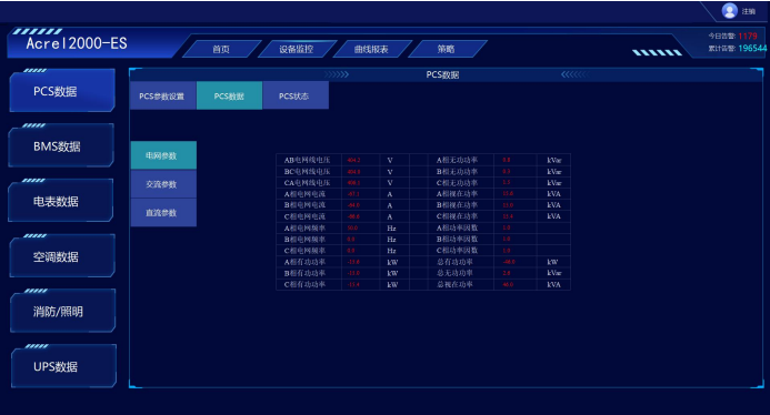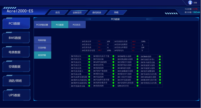 采集并顯示 PCS 系統的相關參數,包括:直流側的電壓/電流/功率等、PCS 的三相有功功率、無功功率、三相電壓、三相電流、功率因素、頻率、運行狀態、報警及故障信息等常用信息,及日輸入電量、日輸出電量、累計輸入電量、累計輸出電量等;