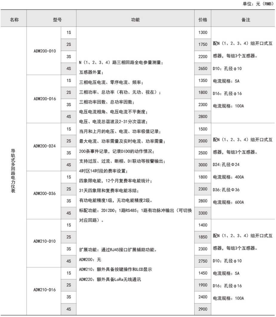 ADW2xx系列導軌式多回路電力儀表主要用于低壓三相回路全電參量測量,同時可選擇四個回路的電流輸入。可直接或間接測量電壓、電流、功率、功率因數、相角、不平衡度、諧波等參數。 還可通過其RJ45接口擴展輔助功能,實現DI、DO、測溫、剩余電流測量,以及2G、4G、LoRa、LoRaWan、NB-Lot無線通信功能。