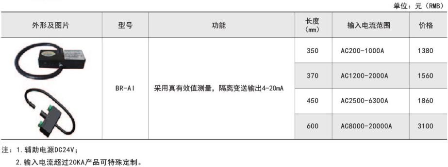 BR-AI 采用真有效值測量,隔離變送輸出4-20mA 350 AC200-1000A