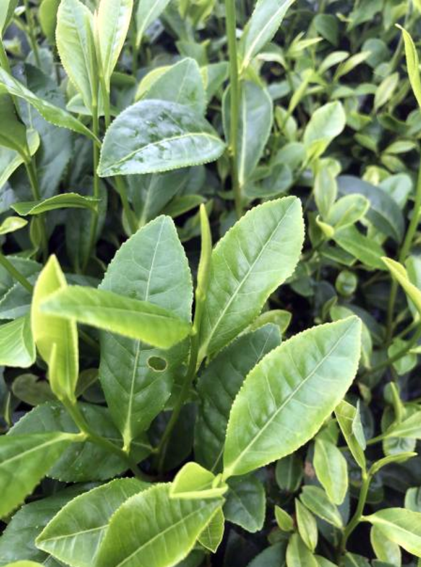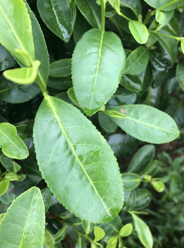 【性狀特征】樹姿半開張,分枝較密。葉片呈半上斜狀著生,橢 服形,葉色綠,有光澤,葉面平展,葉身平,,葉緣平,葉尖漸尖,葉脈11對,鋸齒37對,葉質較厚軟?;ò臧咨?、5瓣,尊片5枚,柱頭3裂。產量高,4~6齡茶園僅春季每667m'可產鮮葉1030kg。春季萌發早。2010年和2011年在長沙縣高橋鎮觀測,一芽二葉初展期分別為4月3日和3月27日,分別比福鼎大白茶早1天和6天。芽葉生育力和持嫩性強,淺綠色,茸毛較多,一芽二葉百芽重20.3g。