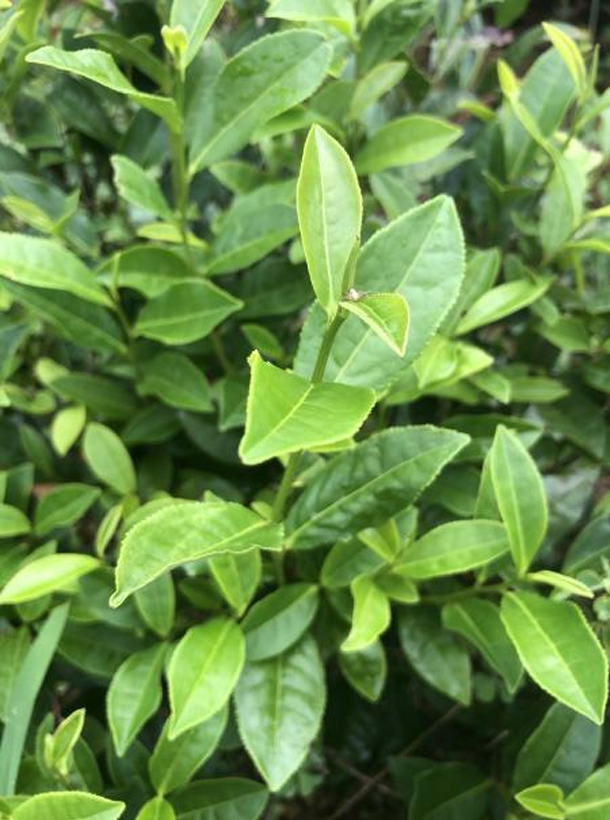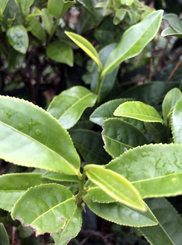 【性狀特征】無性系,小喬木,中葉類,中芽種。該品種樹姿直立,分枝密度中等。葉片上斜著生,葉片長7.7~10.6cm,葉寬2.9~4.2cm,葉長橢圓形,葉色綠且有光澤,葉尖銳尖,葉肉厚而微隆,葉面平,葉脈9~10對,葉齒淺密。